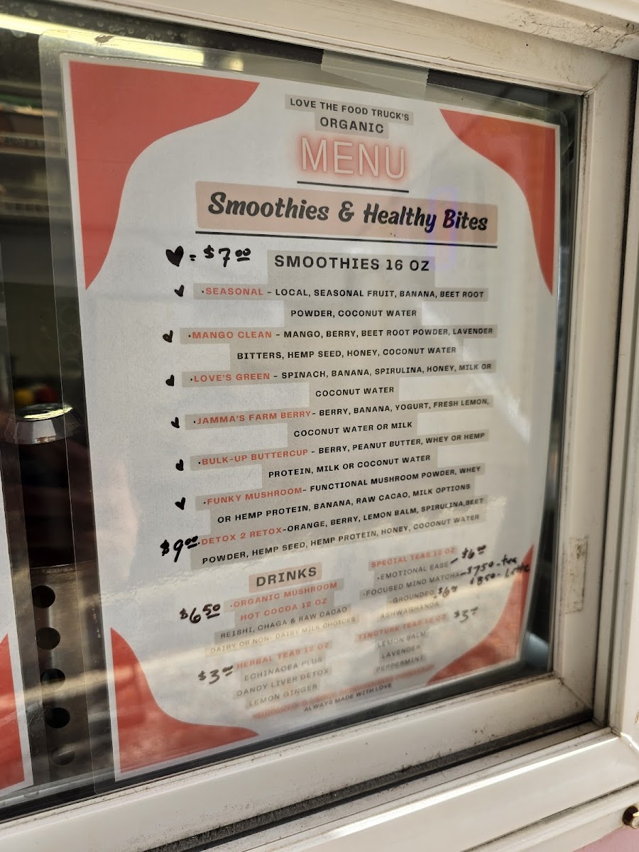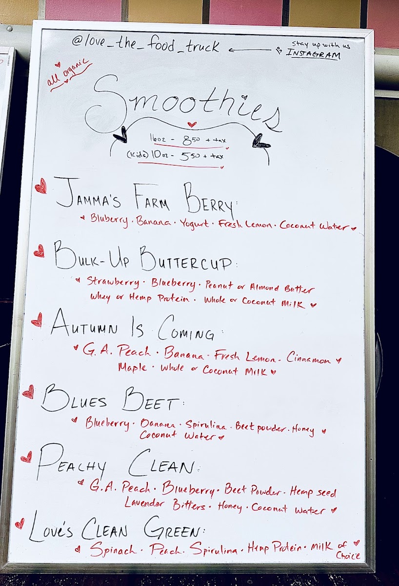 As you wrap up your visit to Love The Food Truck at 404 SE 2nd St in Gainesville, the menu leaves a memorable impression with its fresh, organic focus and simple yet satisfying offerings. The smoothie selection is a highlight, featuring vibrant blends like Jamma’s Farm Berry, Bulk‑Up Buttercup, Mango Clean, Clean Green Smoothie, and Tropical Smoothie, each showcasing wholesome ingredients and a refreshing taste. On the savory side, the lineup includes crisp greens and hearty wraps and salads: the light Love’s Lil House Salad and the more substantial Big House Salad provide fresh, healthy options, while the Brisket Pita Wrap, Chicken Pita Wrap, and Tomato & Cheese Pita Wrap offer flavorful, portable meals perfect for eating on the go. Together, these dishes reflect the truck’s commitment to quality and simplicity, making the menu both approachable and enjoyable.